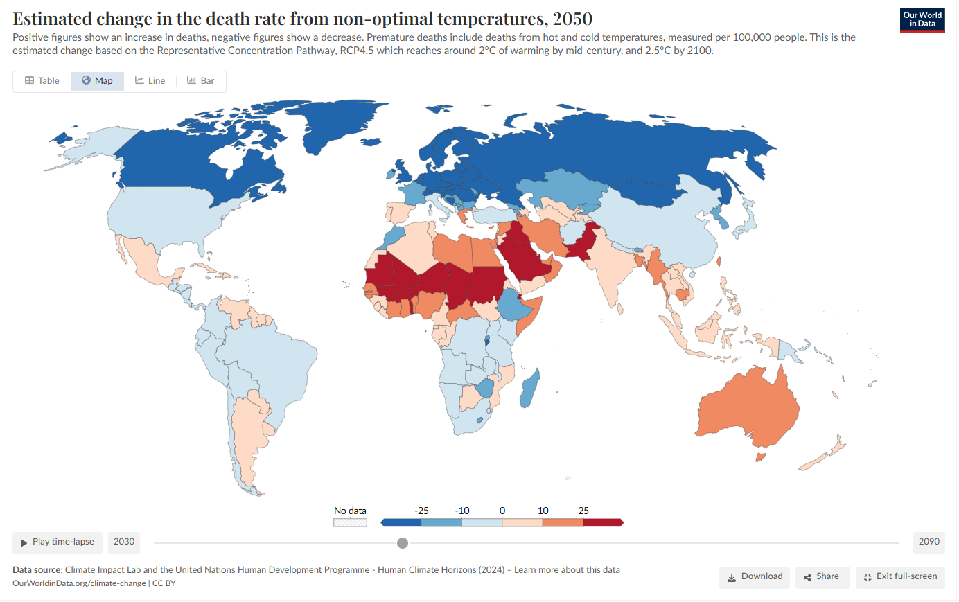 Blue areas in the above map show a decrease in deaths in the future, while red color indicates an increase in temperature-related deaths.