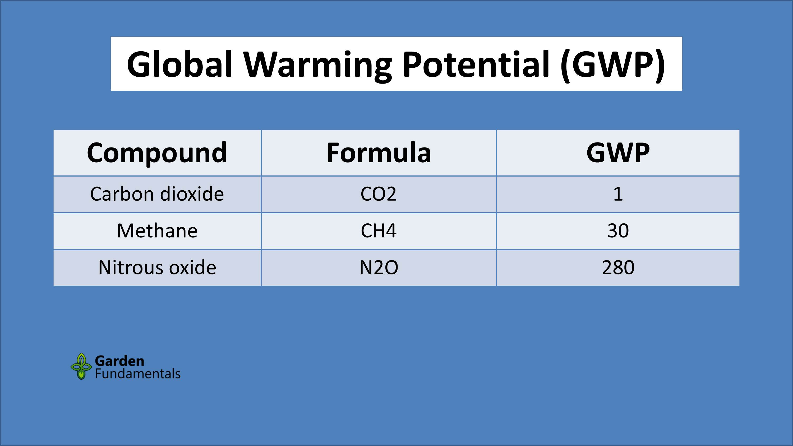 To understand this topic, it is critical to understand something called global warming potential (GWP). GWP is a measure of how much heat a gas absorbs. Carbon dioxide is used as the standard and has a relative value of 1.