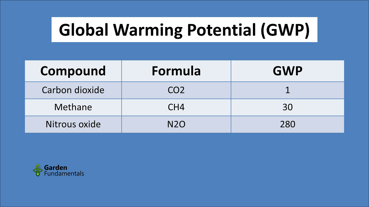 Nitrous Oxide (N2O), commonly called laughing gas, has a GWP of 280. It is 10 times worse than methane, and 300 times worse than carbon dioxide.